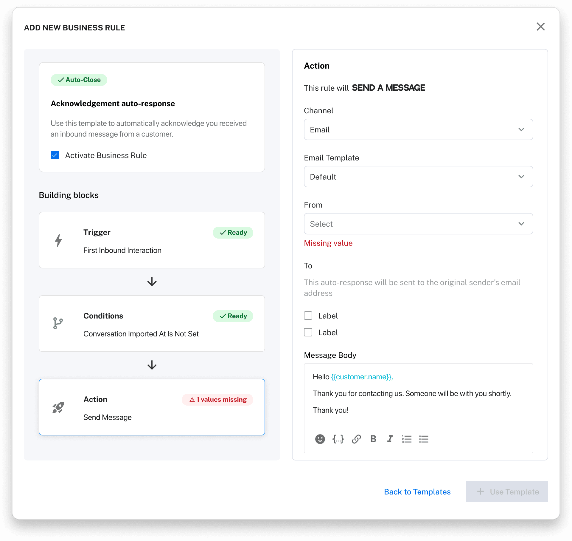 Background: Business Rules in Kustomer allow teams to automate actions using if/then logic. For example, automatically tagging and routing conversations based on message content.