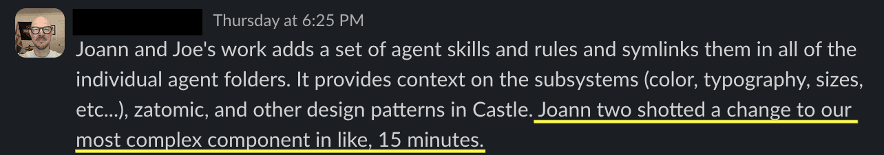 Once I proved it worked, my peer designer adopted the same workflow. Now two designers were keeping Castle moving instead of zero engineers.