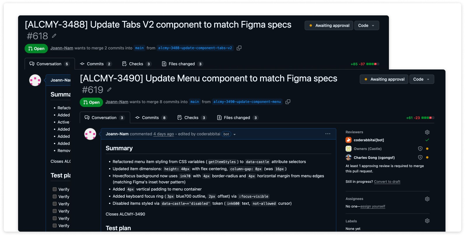 Using the new workflow, I authored PRs for components beyond the original form system — toggles, tables, and navigation elements — proving the workflow scales across different parts of the design system.
